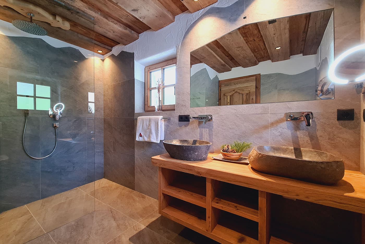Unsere 6 Luxuschalets (ca. 100-120 m²) bieten naturbelassene Altholzmöbel, voll ausgestattete Küche, private Sauna und/oder Whirlpool, Smart-TV, W-Lan, sowie Frühstück & Halbpension-Option. Die Chalets sind unterirdisch mit dem Haupthaus verbunden.